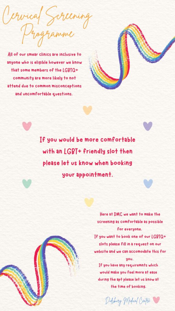 Here at Didsbury Medical Centre we want to make sure that all our patients are as comfortable as possible in every appointment. We want to allow you to control the environment that you would feel most comfortable in. If you would like an LGBTQ+ Cervical Screening appointment and have any personal requirements, please let us know and we will be happy to accommodate.